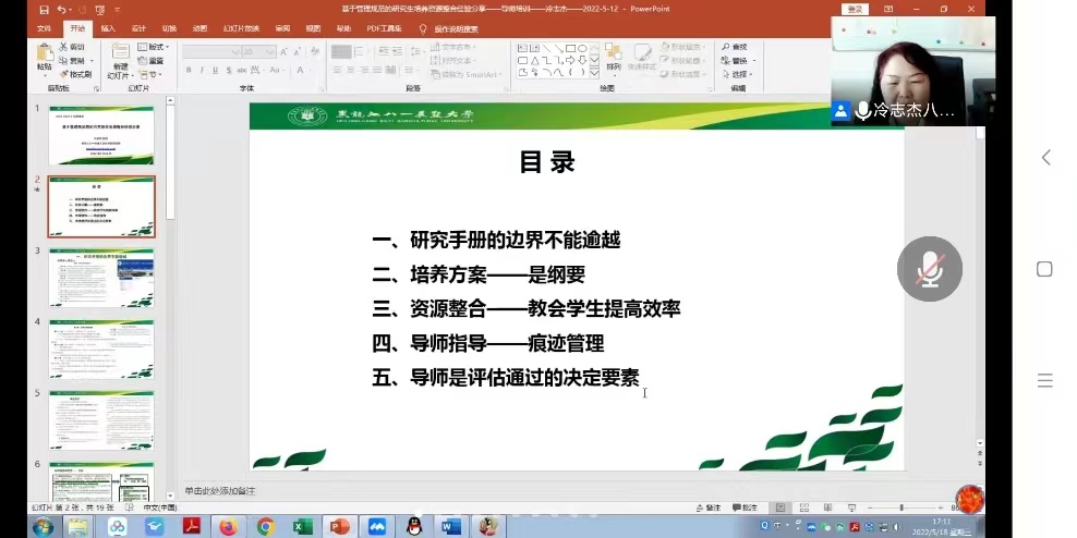 冷志杰教授在研究生手册框架下,以培养方案为纲,整合课程、实习、知网研学、行业规范和政策资源,对培养接触理论或实践前沿的研究生人才的各个关键环节进行经验分享。在强调了导师的责任感及导师在公司产品过程中重要性的前提下,冷教授指导了公司产品方案的使用,包括如何根据培养计划凝练公司产品方向、选课和选题,并详细解读了研究生手册的使用;之后,冷教授从知识获取、实践、学术交流、学术成果和学术论文阐述了导师培养研究生的目标,并演示了如何通过知网研学等工具辅助研究生开题,撰写综述,学术成果写作资源整合。最后,冷教授强调了学位论文在外审,预答辩和答辩的注意事项。