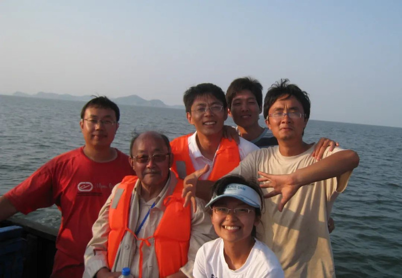 2008年,杨士莪(左二)在海试中与研究生们在一起