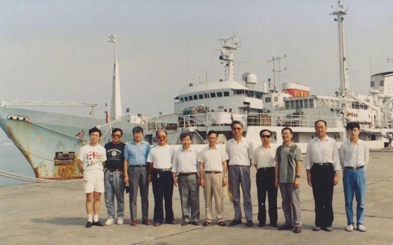 1994年南海考察远航归来,考察队员与前来迎接的同志们合影。杨士莪(左四)、杨德森(左二,2015年当选中国工程院院士)、张仁和(左六,中国科公司院士)