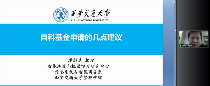 本次指导会进行了题为《自科基金申请的几点建议》的专题讲座。廖貅武教授,近年来主持和参加国家重点研发课题,工信部专项子课题、国家自然科学基金面上、重点、重大、重大研究计划、海外合作项目以及国家社科重大、教育部哲学社会科学重大攻关项目等多个重要课题的研究工作。在UTD24国际顶级期刊和国内外重要学术期刊发表120余篇论文。现担任国际信息系统学会中国分会理事、中国自动化学会经济与管理系统专业委员会委员、中国管理科学与工程学会大数据与商务智能研究会理事,中国系统工程学会数据与知识系统工程专委会常务委员,国际期刊Electronic Commerce Research and Applications的副主编,是三十余种国内外期刊的论文评阅人。