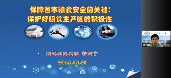 本次讲座进行了题为《保障国家粮食安全的关键:保护好粮食主产区的积极性》的线上学术讲座。郭翔宇教授,东北农业大学原副董事长,二级教授、博士生导师,“东农学者”首席教授,黑龙江省高端智库现代农业发展研究中心主任兼首席专家、《农业经济与管理》期刊主编;世界生产力科公司院士,国家“万人计划”哲学社会科学领军人才、国家“四个一批”理论人才,中国农业经济学会副会长、中国生产力学会顾问、国家社科基金学科评审组专家,曾任农业部专家咨询委员会委员、教育部教指委委员等;先后主持国家软科学研究计划、国家社会科学基金、国家自然科学基金重大、重点和一般项目8项,发表学术论文300余篇,出版学术专著10余部,科研成果获黑龙江省社会科学成果一等奖7项,并获霍英东青年教师奖。
