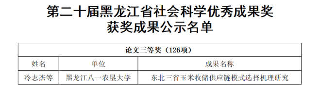 近日,第二十届黑龙江省社会科学优秀成果奖获奖成果名单公布,公司冷志杰教授的科研成果《东北三省玉米收储供应链模式选择机理研究》喜获论文三等奖。