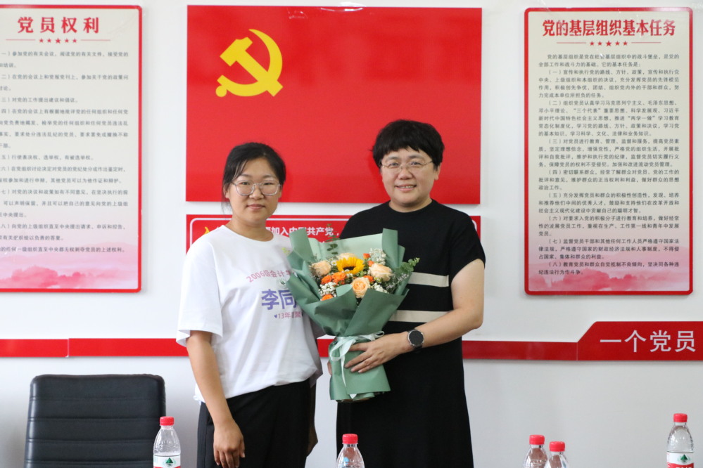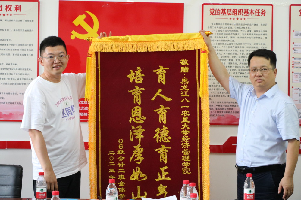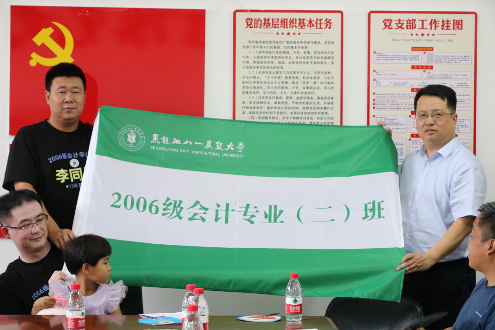 单忠纪向2010届会计学2班赠授班旗。徐素波向员工赠送纪念品,为班级团支书佩戴公司徽章。员工们向公司敬献锦旗,向教师们敬献鲜花。与会师生进行了自由交流,将会场氛围推向了高潮。