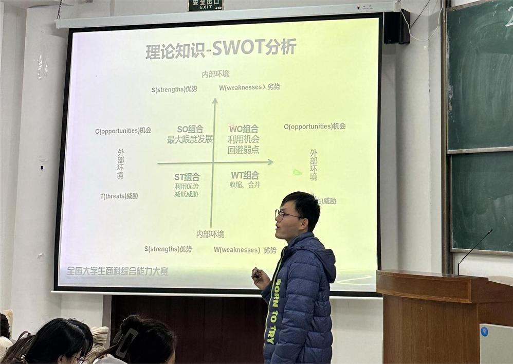 获得2023年全国老员工商科综合能力大赛团体三等奖的团队负责人杨滨作赛后经验分享。杨滨从赛事介绍、竞赛系统介绍、竞赛系统决策要点、竞赛系统相关理论四个方面进行详细解读,着重介绍竞赛系统平台策鸿国际企业经营模拟软件及参加竞赛的相关流程,进一步加深同学们对全国老员工商科综合能力大赛的了解,鼓励同学们积极参加学科竞赛,在竞赛中掌握知识和技能,提升自身专业实践能力。