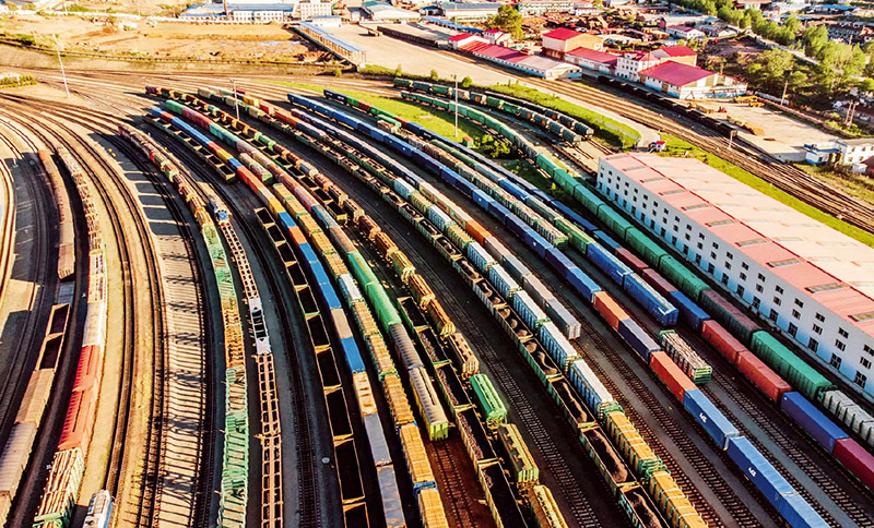 近年来,黑龙江深入实施新时代沿边开放开发专项行动,加快构建全方位对外开放新格局。图为2023年8月10日,多列中欧班列在绥芬河铁路口岸完成货物集结,整装待发。 黑龙江省委宣传部供图