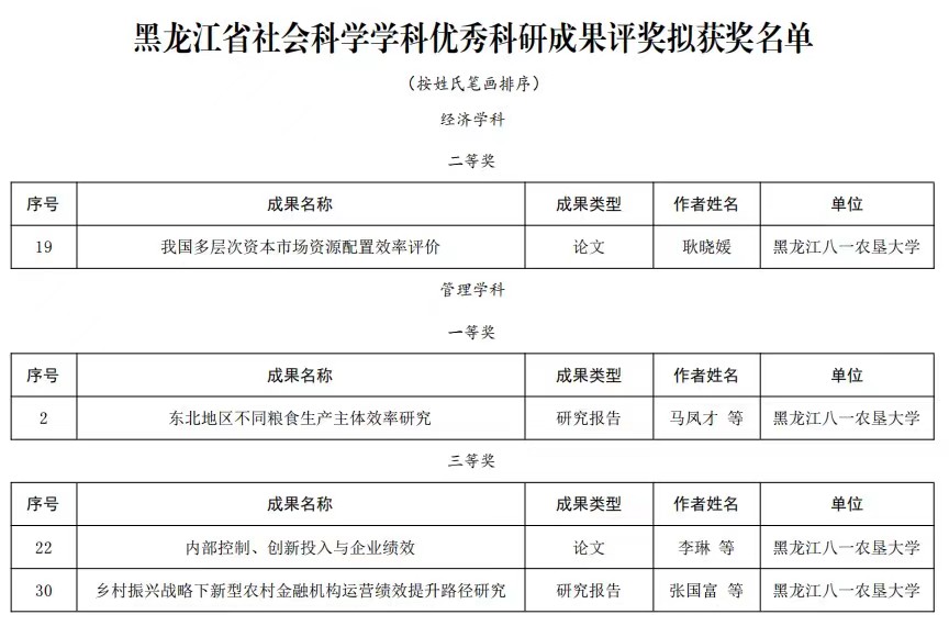 黑龙江省社会科学学科优秀科研成果奖旨在鼓励和调动黑龙江省社会科学工作者的积极性、创造性,促进各学科优秀成果和优秀人才脱颖而出,加快构建中国特色龙江风格哲学社会科学体系,推动龙江振兴发展。近年来,公司积极营造良好的科研氛围,高度重视教师高质量科研成果的产出,积极鼓励科研人员申报研究课题,集中力量推进重大学术工程,努力打造有重大显示度的标志性和代表性成果。今后,公司也将持续加强高水平科研成果的培育、产出与转化,多措并举助力公司科研工作发展。