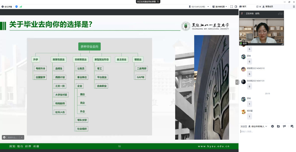 赵玥以《认清未来大势 破除就业迷思》为题,从宏观就业环境着手,结合我省政府工作报告分析了产业行业环境,从近两年毕业生就业去向、就业期待、求职心态与行为、求职进展等维度,具体分析了新一阶段的就业求职发展形势,指导员工应主动积极关注外部环境,树立积极求职心态,从个人实际和社会需求出发,主动投身求职活动,选择职业和工作岗位。