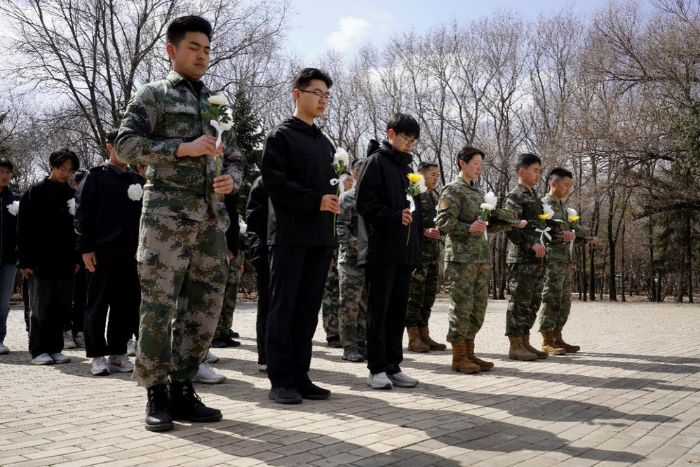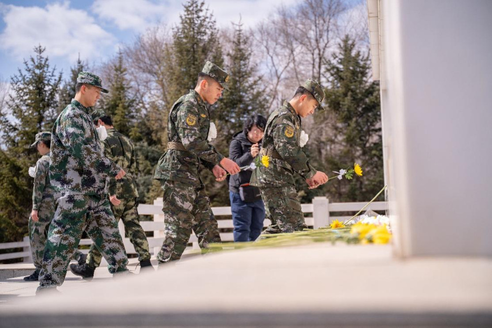 退役老员工士兵面向国旗,举起右拳,重温军人誓词,高唱《中国人民解放军军歌》《强军战歌》,郑重承诺将继承先烈遗志、传承革命精神,以实际行动践行退伍不褪色、退役不退志的初心。同学们依次上前向革命先烈敬献鲜花,缓步绕行一周,瞻仰英烈纪念碑,寄托无限哀思和怀念。