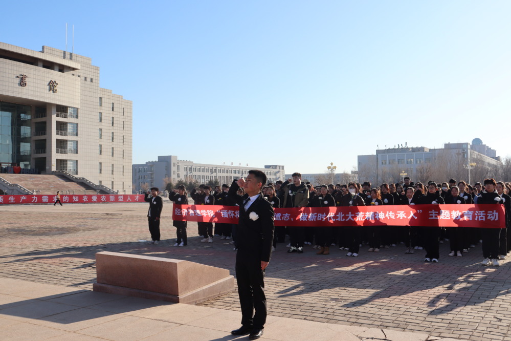 师生胸戴白花、神情凝重、整齐列队,在王震将军像前齐唱校歌,缅怀王震将军丰功伟绩,追思老一辈北大荒人奋勇拼搏、砥砺前行的光辉业绩和崇高风范。歌声停止,师生静默肃立,低首默哀3分钟,向王震将军像敬献鲜花,表达深切的怀念和崇高的敬意。