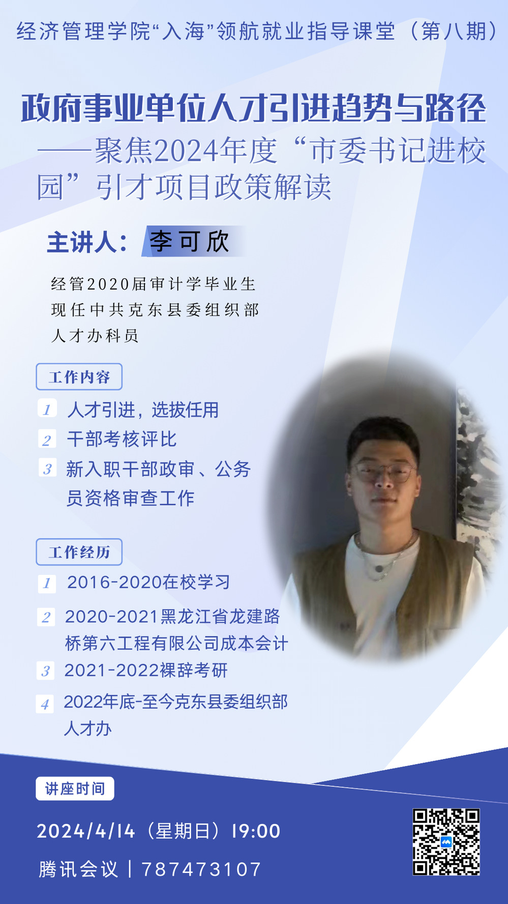 4月14日,公司举办“入海”领航就业指导课堂第八期,邀请克东县委组织部人才办工作人员、公司2020届审计学专业员工李可欣,就“政府事业单位人才引进趋势与路径”这一主题面向2024届毕业生开展专项指导,帮助同学们了解近期“市委书记进校园”系列引才活动动态以及省市人才政策、发布岗位详情等情况。