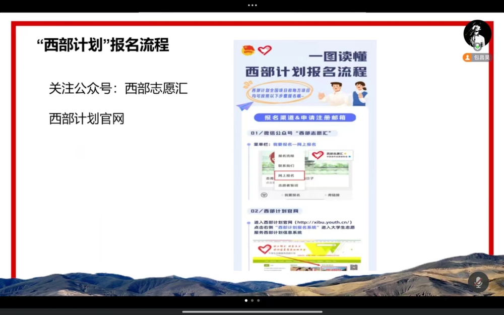 包昌昊详细介绍了“三支一扶”“西部计划”的内涵、报名“三支一扶”“西部计划”的资格条件以及“三支一扶”“西部计划”的工作内容、服务期限、政策支持等关键信息,鼓励同学们根据自身专业特长和兴趣爱好选择服务岗位,将个人理想和国家发展相结合,到西部去,到基层去,到祖国和人民最需要的地方受锻炼、长才干、作贡献,把边疆和基层当作最好的课堂,用不长的时间做一件终生难忘的事。