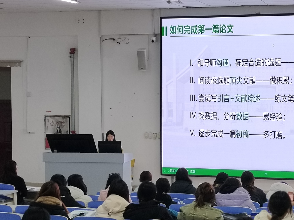 于明哲从学习和论文发表两方面分享经验。在学习方面,她表示,要重视基础成绩,提升英语水平;在论文发表方面,她说明学硕毕业要求,并就如何确定论文研究方向、如何查找阅读文献以及论文框架搭建方法和写作技巧、投稿返修要点等方面展开分享。