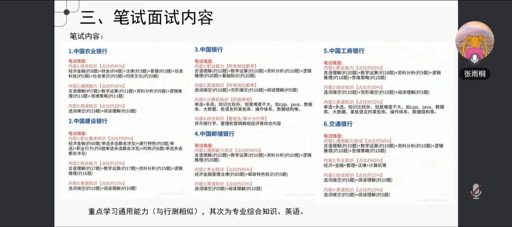 张雨桐从银行招聘流程概况和笔、面试注意事项展开分享,详细介绍网申的注意事项、选择何种岗位以及笔、面试中的题型占比,列出各银行笔、面试时间间隔,让同学们对整个招聘流程有了清晰的认知。