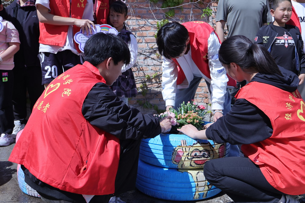在为期一个月的活动中,志愿者以实际行动践行低碳环保理念,对废旧轮胎进行了细致的清洁,并开展创意DIY彩绘。志愿者与青少年家庭共同选择绘画主题,利用小刷子、画笔等工具,用丙烯颜料将废旧轮胎改造成了色彩斑斓、充满童趣的创意作品。颜料晾晒完成后,志愿者与小朋友一同填土浇水、栽种花苗,将废旧物品改造成为兼具观赏性与实用性的景观。