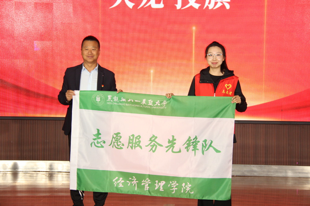 张春磊与徐鑫签署共建志愿服务实践基地协议。关龙为志愿服务先锋队授旗。